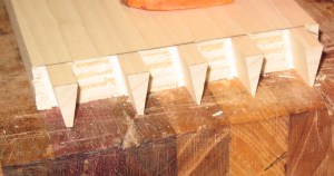 Dovetails, dovetails and more dovetails. The drawers are almost finished. I cracked my favorite .5inch chisel handle while cutting these. I will be heading to Kansas City in a few weeks, gives me a reason to stop at Woodcraft and buy a new one huh. The bottom drawer slides are made of Red oak. I bought a pre made one to use as a template. The pre made cost eight dollars. I figure I got about a buck and half to two bucks in mine. A good coat of wax and they slide real smooth.