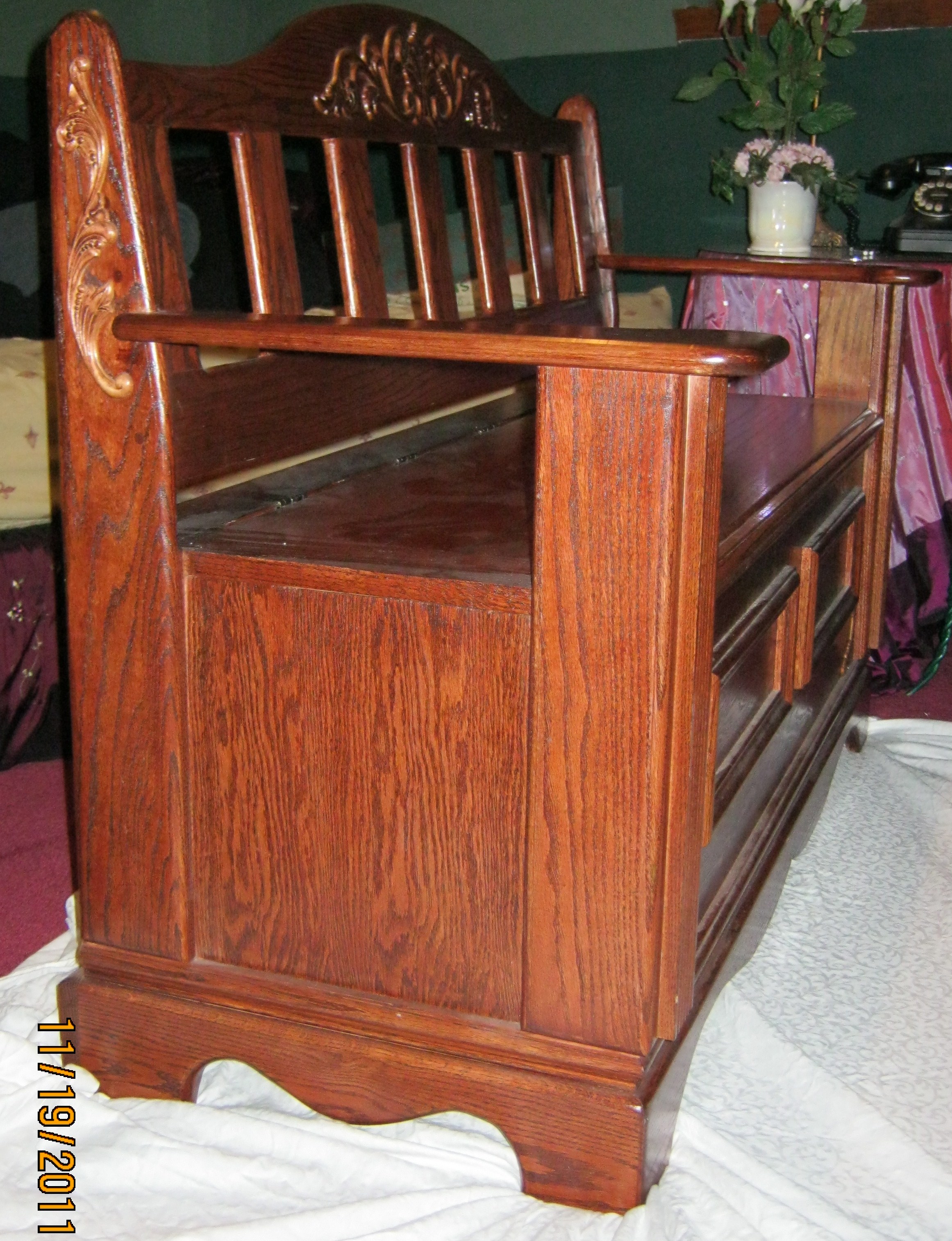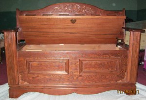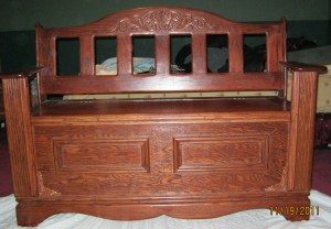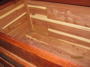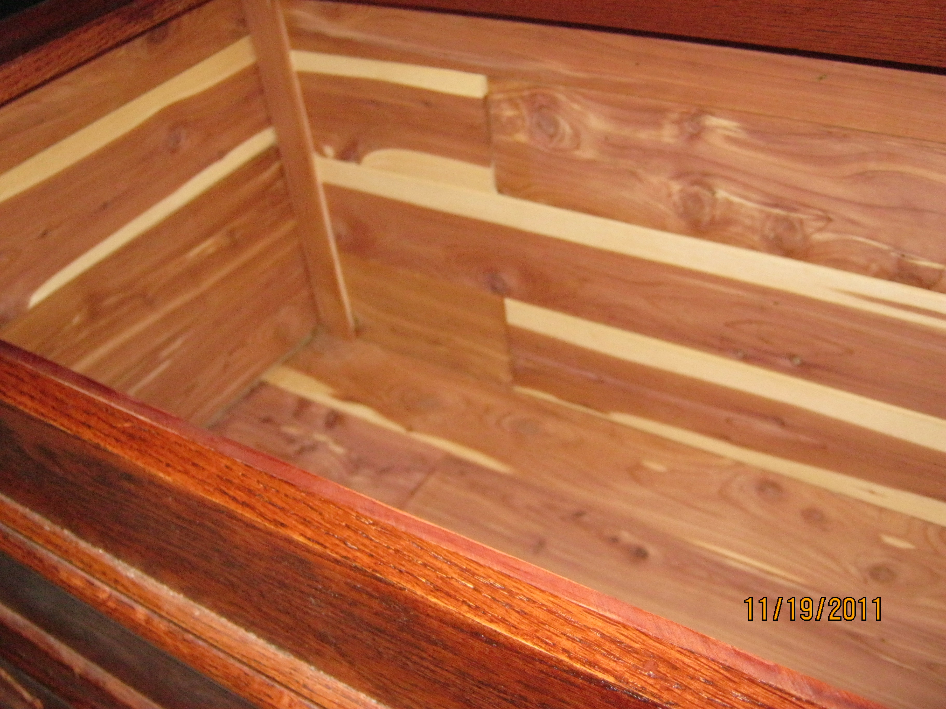 Back in 2002 my woodworking tools were pretty sparse. I’m sure my woodworking knowledge was lacking also. It was time to build my “favorite” daughter a hope chest. I found a set of plans I liked . I can’t remember where. All of the oak was purchased from one of the big box stores, probably Home Depot , so I am sure I payed a premium price, probably around five bucks a board foot for common red oak in 2002! I can buy this wood today for about 2.50 a board foot. My oldest son was doing subcontracting at this time, and gave me a bunch of cedar closet lining that was left over from one of his jobs. The chest is finished with dark walnut min-wax stain then clear coated with poly. I would finish it differently now. I added little Victorian on-lays that the plan didn’t call for. The brass hinges for the lid were either purchased at my local True Value or again Home Depot. It has sat in my daughters bedroom for the last decade. She is married now and her and my son in law and grandson have a home of their own. My wife wants to make her room into a guest room so its time for the chest to go to its new home.