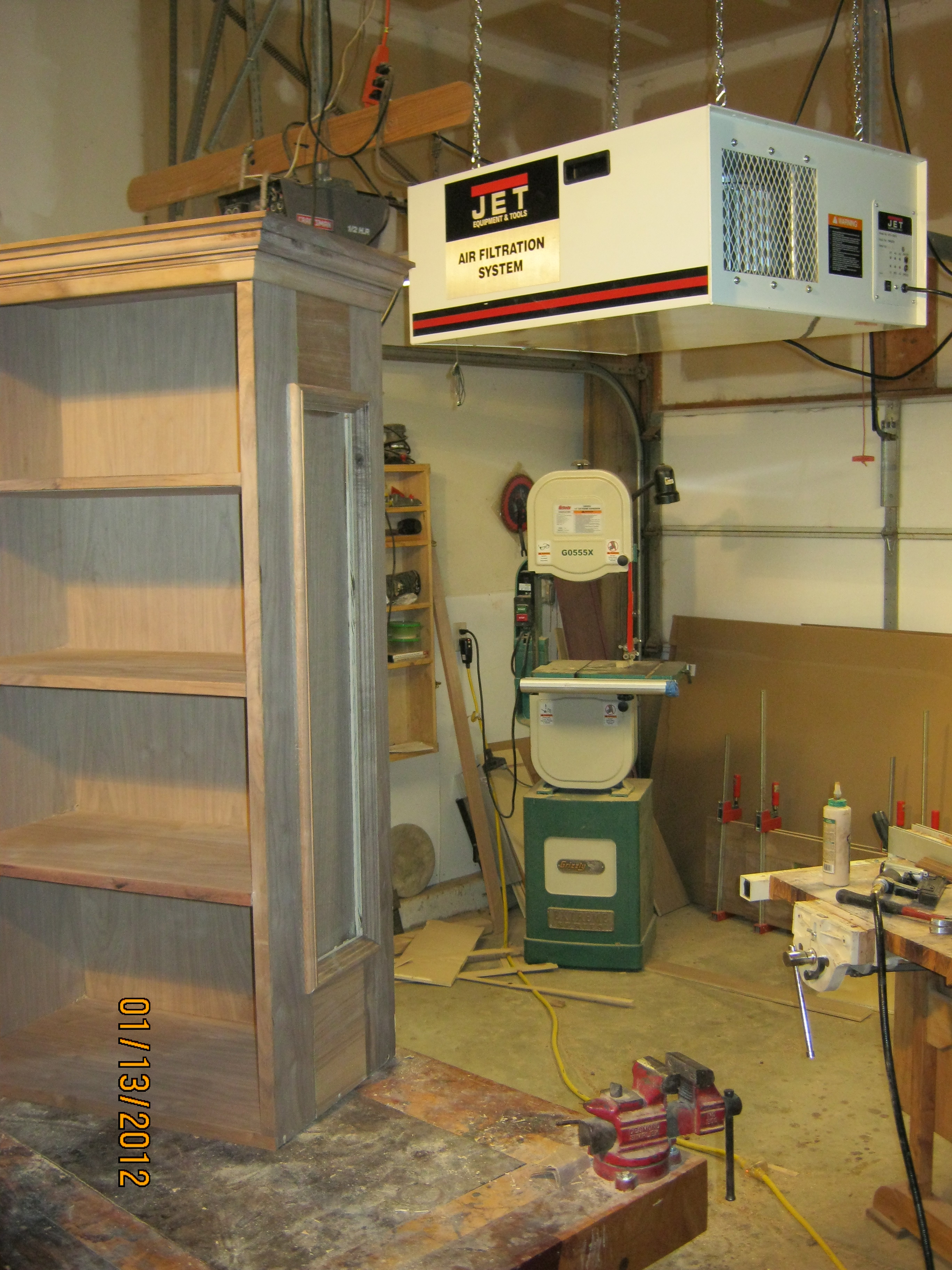 Haven’t wrote much lately. Trying to finish up some promised stuff so I can start on a big library book shelf project. You know who you are- thanks for your patience. Last week I was browsing E bay when I noticed a Jet air filtration system going for a very good price. I have been thinking about buying one of these for about two years. Matt(my son) and I hung it from the ceiling. I am amazed at how much difference this thing makes. I can actually see dust in the air being drawn to it as I work. The same dust I was breathing! I guess I’m guilty of being one of those woodworkers that buy their most important tool last?