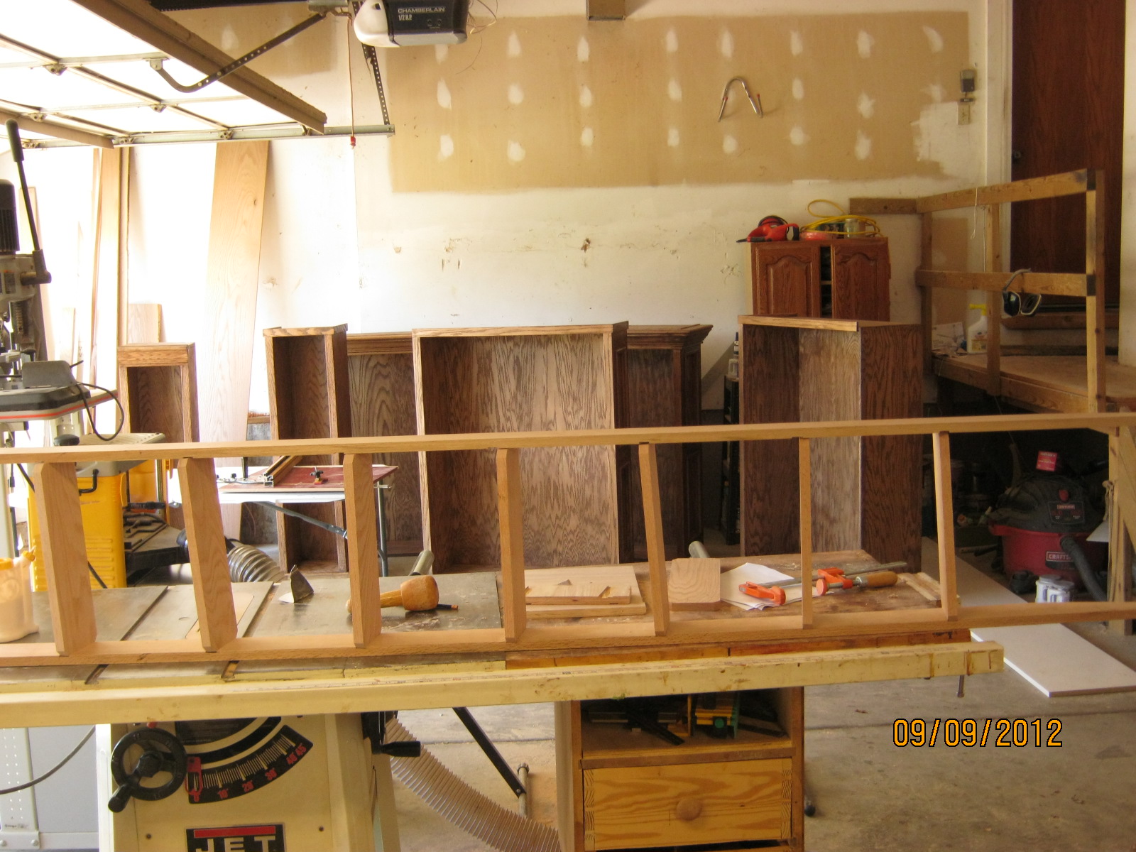 My garage/shop space is slowly disappearing with the creation of the library bookshelf system, but I am finally starting to see the end. I got the entire east wall and 2 pieces of the North wall stained now awaiting the first clear coat.
