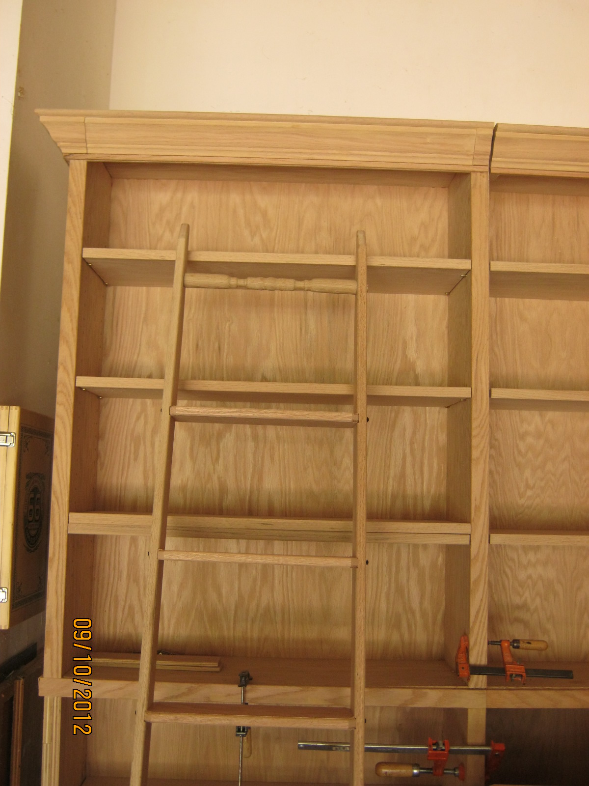 In the foreground you can see the beginning of the library ladder I cut out yesterday. Today I worked on getting the ladder together. It is dry fit at the moment. I’ll take it apart again, finish sand , stain then glue it together.